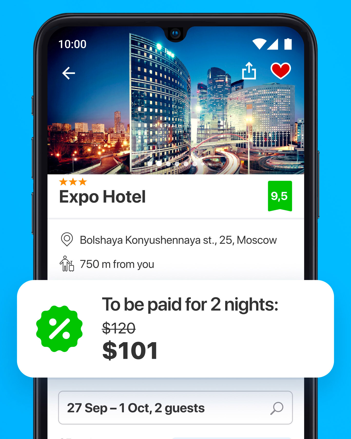 يتيح هذا التطبيق الدفع بالبطاقات البنكية الروسية فقط، ولكنه يحتوي على العديد من العروض التي تسمح بدفع أجرة الايجار عند الوصول. كما يمكنكم حجز فندق أو شقة من خارج روسيا من دون دفع مسبق أو بطاقة بنكية.